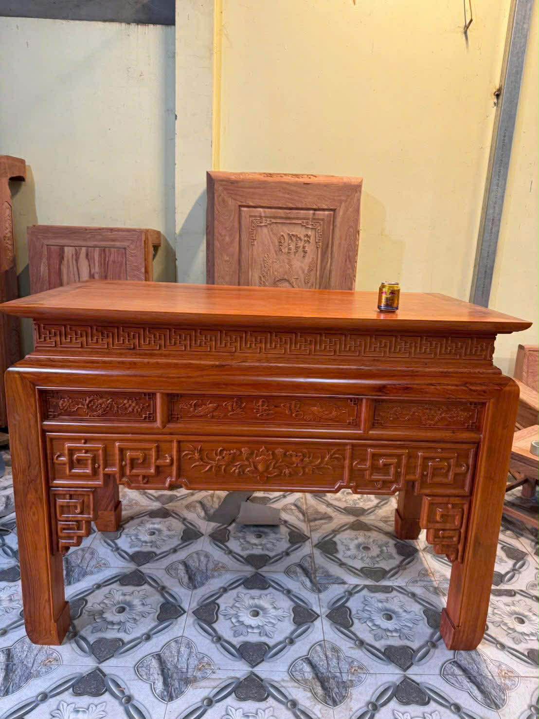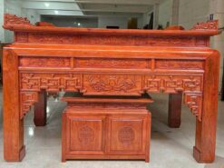 Bàn thờ án gian gỗ gụ được chạm khắc hoa văn truyền thống như tứ linh (Long – Lân – Quy – Phụng), hoa sen, hoặc chữ Phúc – Lộc – Thọ, mang ý nghĩa phong thủy tốt lành, giúp gia chủ gặp nhiều may mắn, bình an.